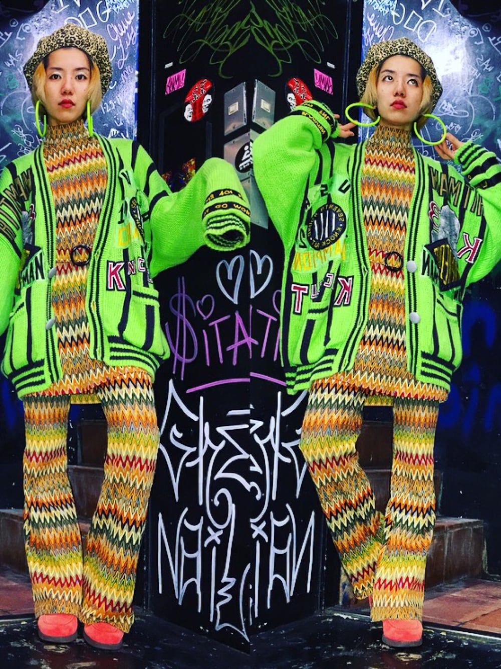 サイケデリックで道を歩いてるとジロジロと見られるコーディネートです。 頭はヒョウ柄、ボディはギザギザボーダー、そして80sの派手なニットカーディガンをオン。 ネオンカラーのビッグなフープピアスで全体を引き締めた(つもり)。