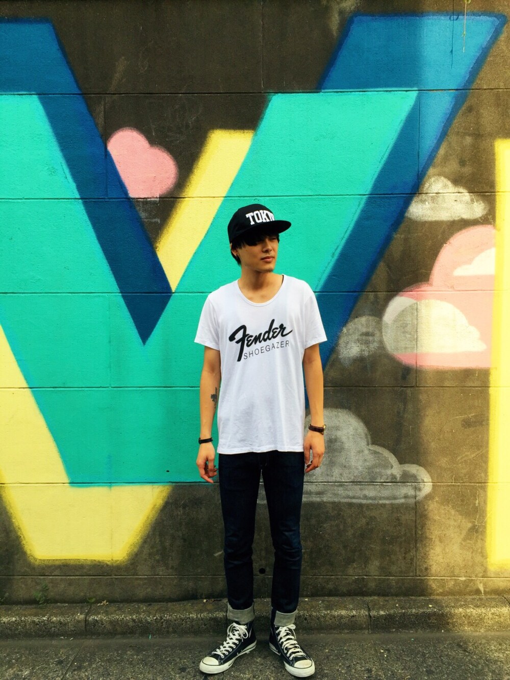 LADのフェンダーTとスキニーで ちょっとバンドマンっぽくしてみました。 ミクスチャーバンドマン風??(笑) TOKYOキャップのインパクト強い… 背景のVを真似したらYになっちゃいました。