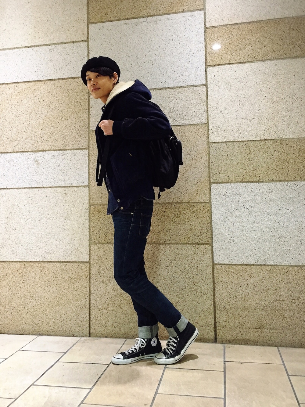 ブラック系のスニーカー、ブラック系のハンチング/ベレー帽を着用したメンズの秋コーディネートの1枚目の写真