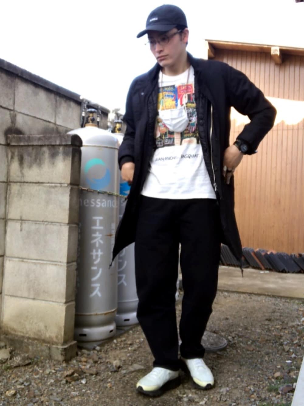 ホワイト×ブラックコーデ。 Tシャツはバスキアです。 アウターのフードは外してます。