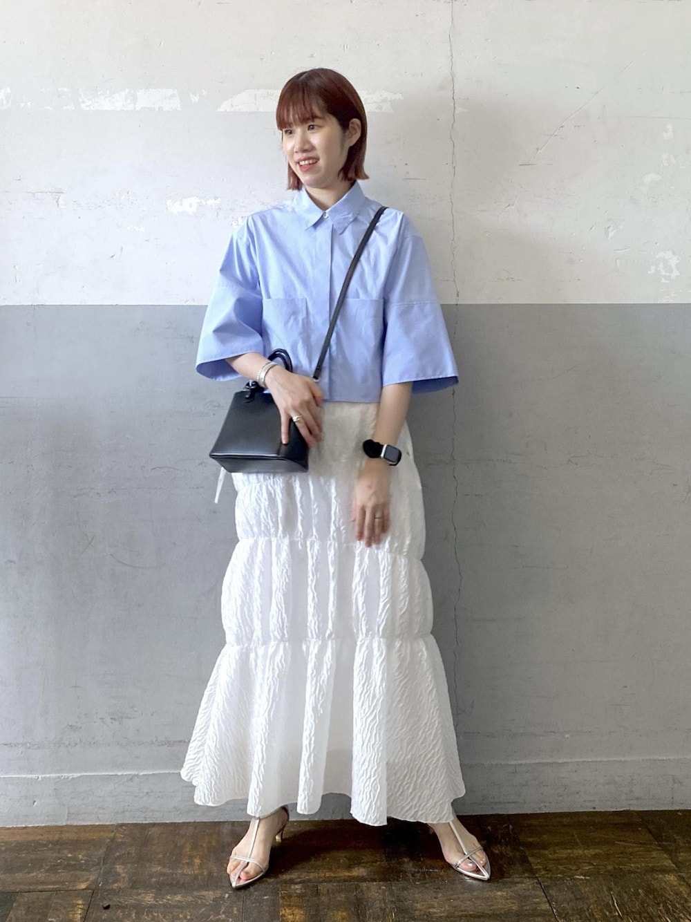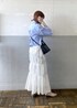 こんにちは!ご覧頂き、ありがとうございます。 逸品シリーズより、オススメのスカートをご紹介。 こちらのスカートは、ホワイトとブラックの2色展開。 昨年のデザインから改良を加え、ウエスト部分は紐で調節が可能になりました!サイズ展開もあり、167cmの私でも長めで履ける丈感なのもお気に入りポイントです。 表面が凹凸があるジャガード素材で、シワになりにくいのも嬉しいです!また、程よくフレアに広がるシルエットが綺麗で、Tシャツに合わせるだけでも、品のある印象に。 ウエストのリボンは垂らしたままでも、リボン結びにしてもどちらでも大丈夫です! デザインのあるスカートなので、トップスはシンプルなものを合わせるだけでも可愛いですよ♪ 今回は、クロップド丈のシャツを合わせてみました。丈感短めと合わせると、よりスタイルアップ効果もあってオススメです!是非、ご覧下さいませ。