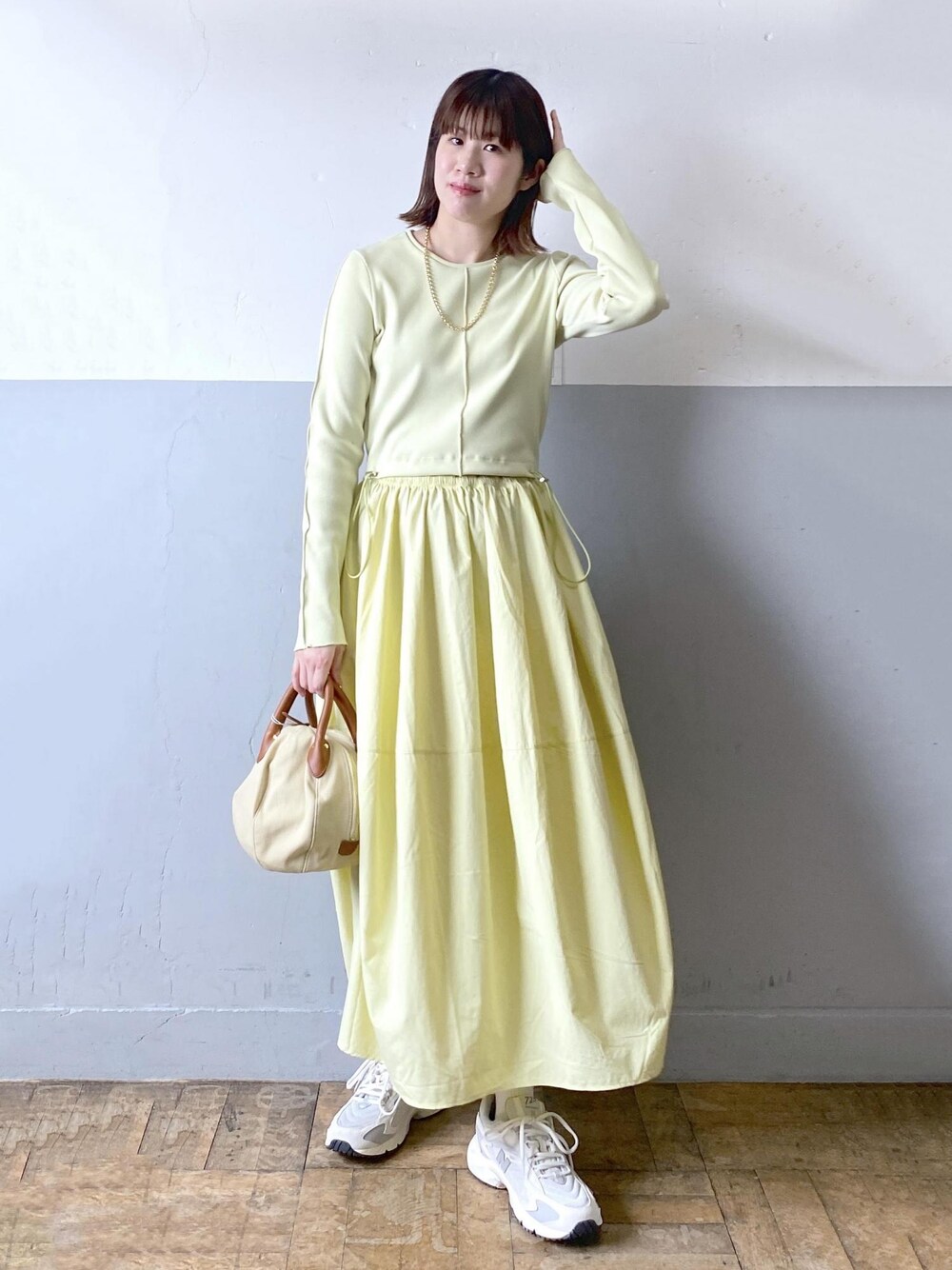 こんにちは!ご覧頂き、ありがとうございます。 春らしいカラーのオススメワンピースをご紹介致します。 こちらのワンピースは着用しているライムイエローと、ブラック、ホワイトの3色展開。 トップスとスカートがドッキングされているデザインの、ワンピースです! リブのトップス部分は、袖はすっきりと細めで、上からジャケットやカーディガンも羽織やすいです。 スカート部分は、シャカシャカとしたナイロン素材。シワを気にせず着れるのが嬉しいポイント。 スカートのウエスト部分は、アジャストで絞れるので調整可能!ゴムなので、着心地も楽ちんですよ。 一枚でスタイリングが完成するワンピースです! 是非、ご覧くださいませ。