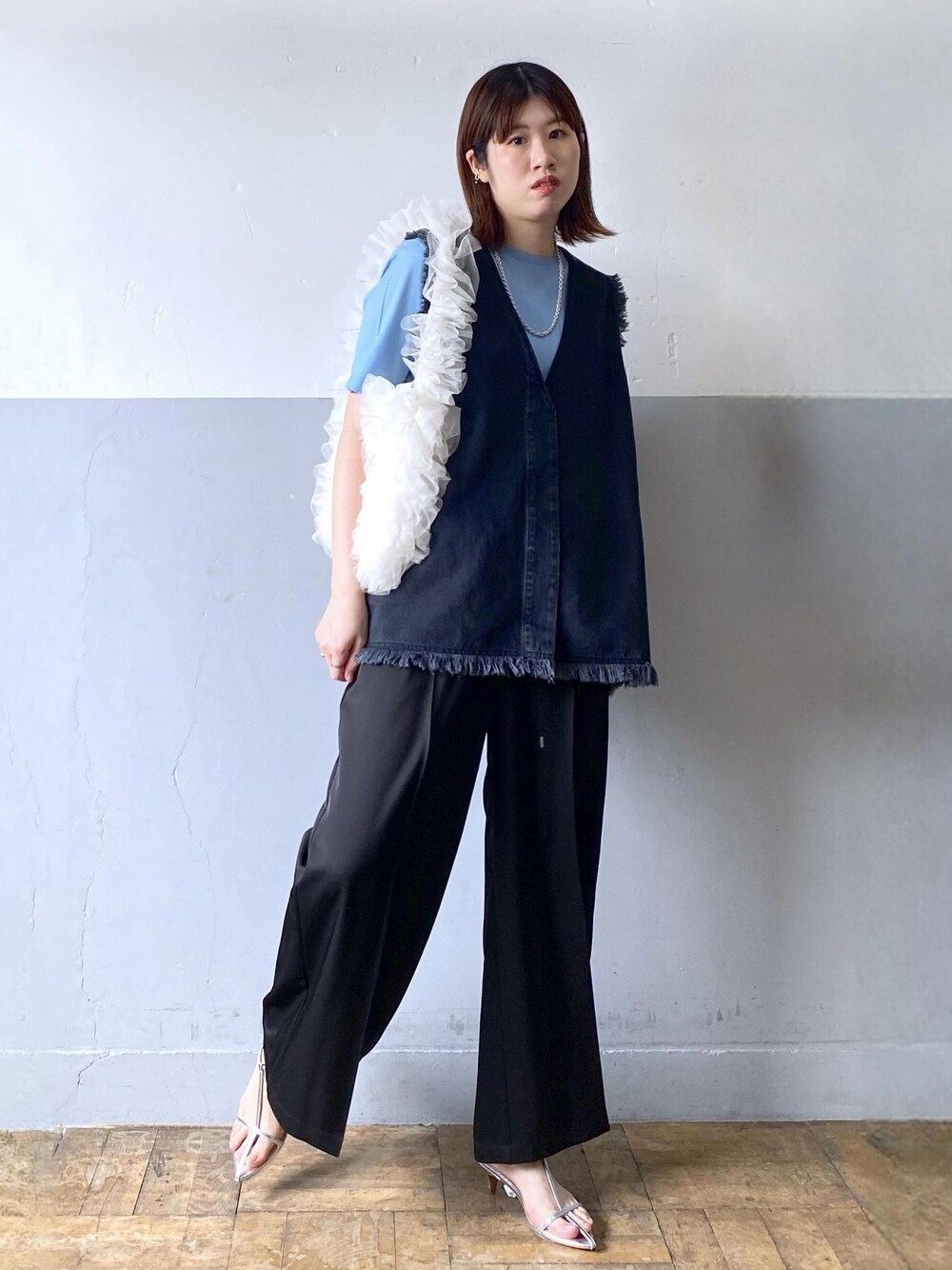 こんばんは!ご覧頂き、ありがとうございます。 リアルバイした、デニムベストの着回しスタイリングをご紹介します。 今回は、少し綺麗目に艶感のあるワイドパンツにヒールを合わせたスタイリングに。 デニムでもブラックなので、カジュアルになり過ぎないのが嬉しいポイント! カラーアイテムとの相性も良いですよ! 是非、ご覧下さいませ。 【tops】 brand:AURALEE code:EUM34050 color:LIGHT BLUE size:0 price:¥19,800(税込)