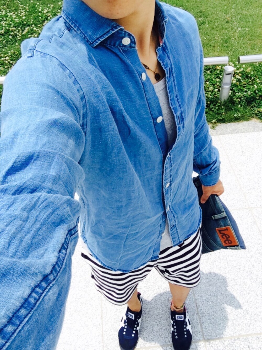 連続投稿! これは先週平和記念公園で! 海意識のリネン素材のデニムシャツで涼しげに🏄