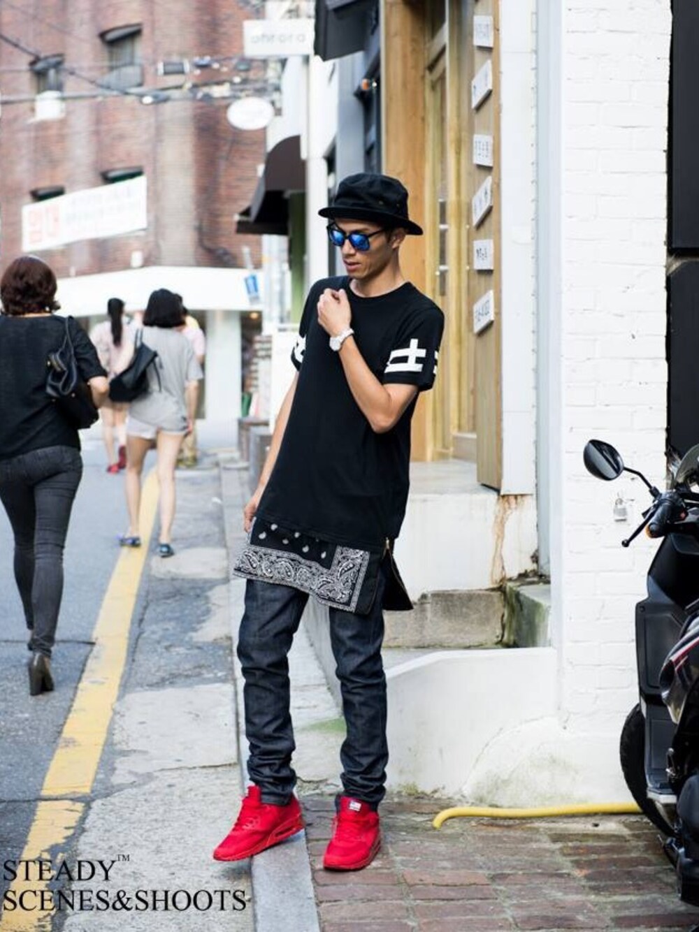 その他のデニムパンツ、レッド系のスニーカーを着用したメンズの春コーディネートの1枚目の写真