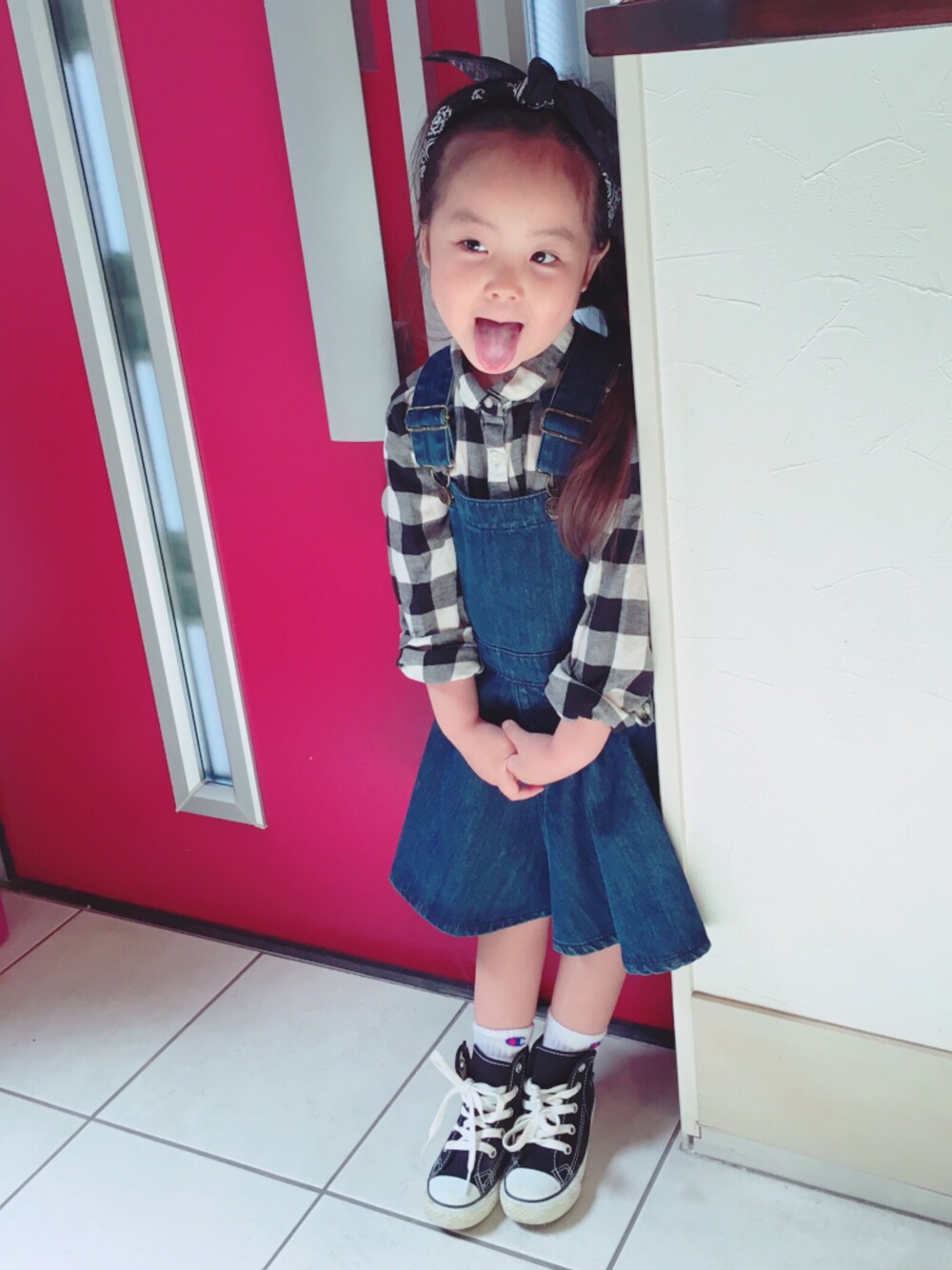 なかなか写真を撮らせてくれなーい😵 今日はジャンパースカート!まだちょっと肌寒いので、ジャンパースカートの中にレギンスをチョッキン✂︎して履かせました✨