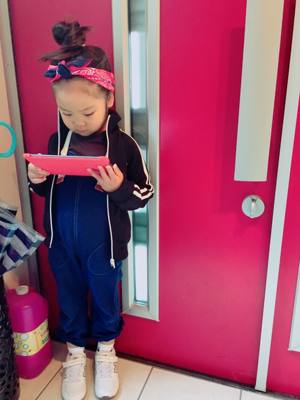 今日はタブレットに夢中&ご機嫌ナナメ… 全く顔を見せてくれない娘っ子w まーいっか〜と写真を撮る母😁 今日はスニーカー以外は全てお下がりコーデです💕