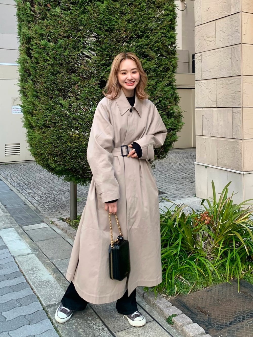 今季MOUSSYのスプリングコートは長めで着たかったので2のサイズで着ています。少し大きめの襟のものを選ぶことでボタンを閉めても小顔効果あります‪‪☺︎‬