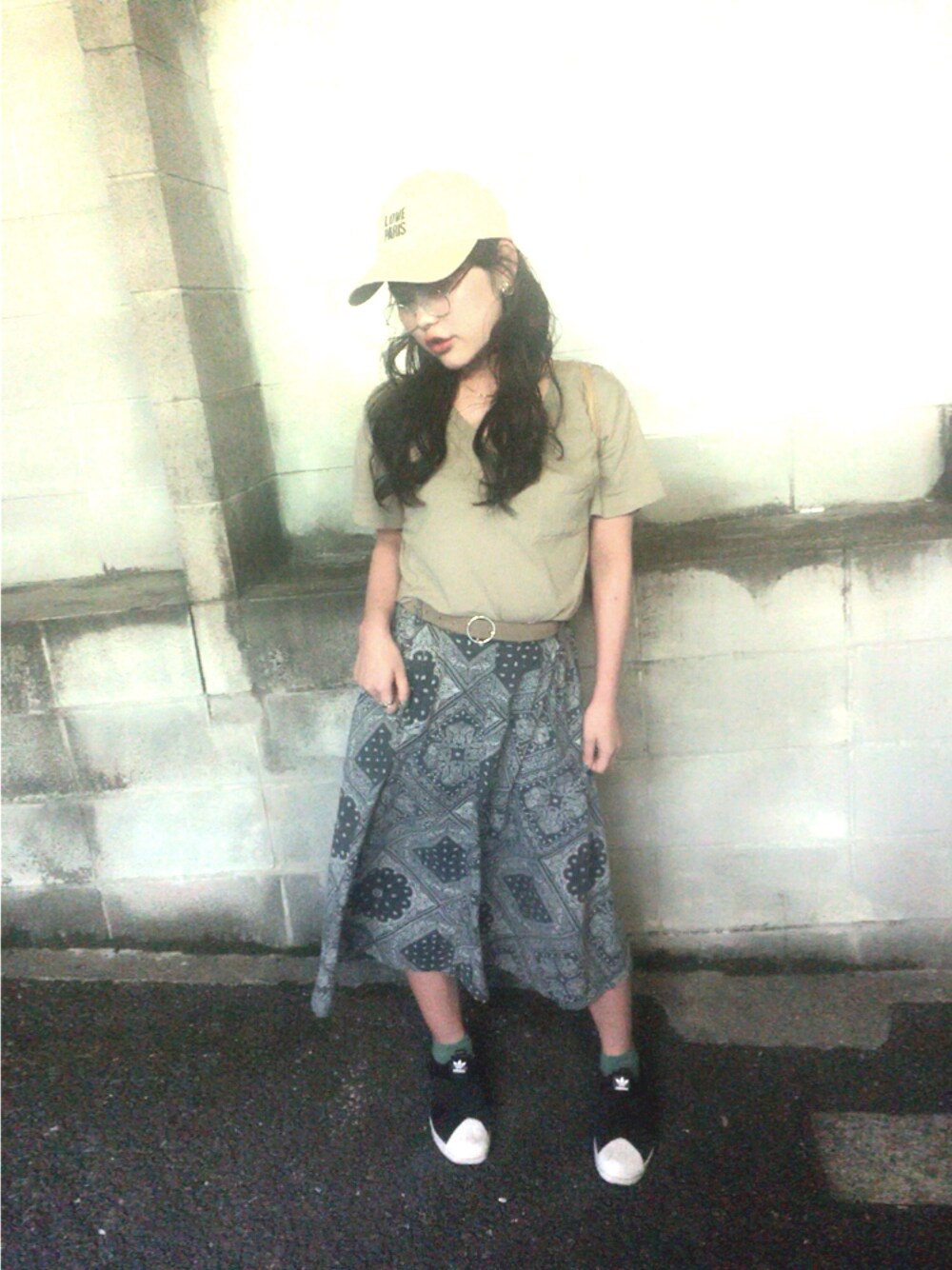 camキャップ×丸メガネ×カーキーT/S×ペイズリー柄SK×adidas