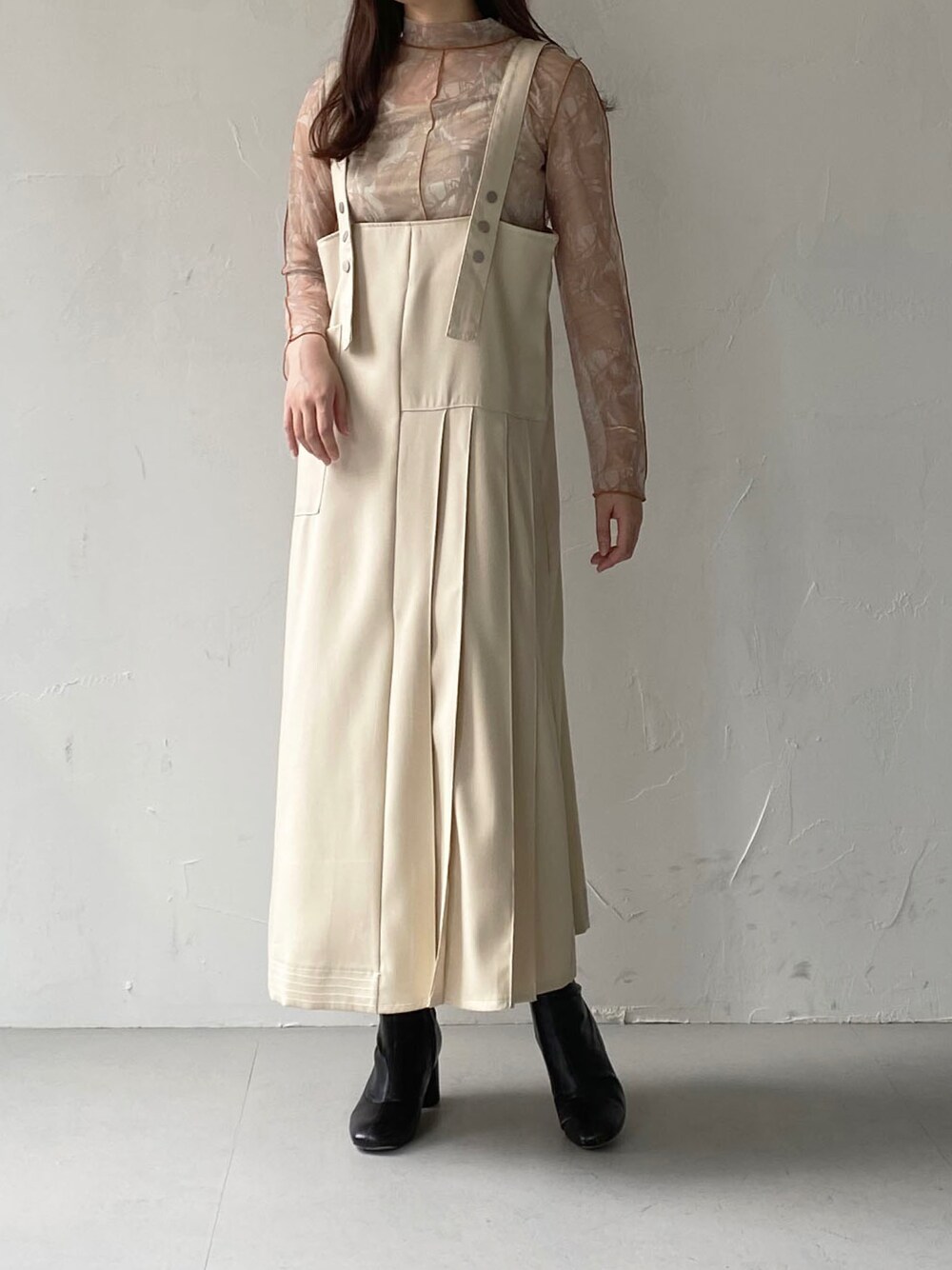 ご覧いただきありがとうございます🫶🏻 トレンドライクなシアートップスにジャンパースカートを合わせたコーデにしてみました! ジャンパースカートはアシンメトリーなデザインで360度かわいいデザインです👌🏻