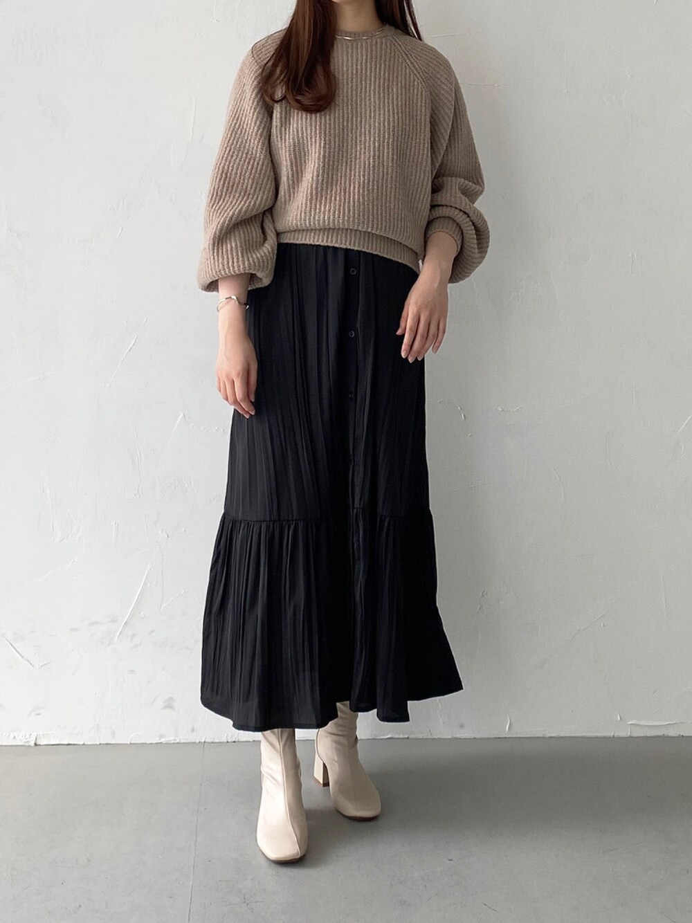 ご覧いただきありがとうございます🫶🏻 厚みのある暖かいボリュームニットとワンピースを合わせた大人カジュアルなコーデにしてみました! ワンピースは夏に1枚で着て、秋はニットやカーディガンと組み合わせた着回しアイテムとして大活躍です❤️🔥