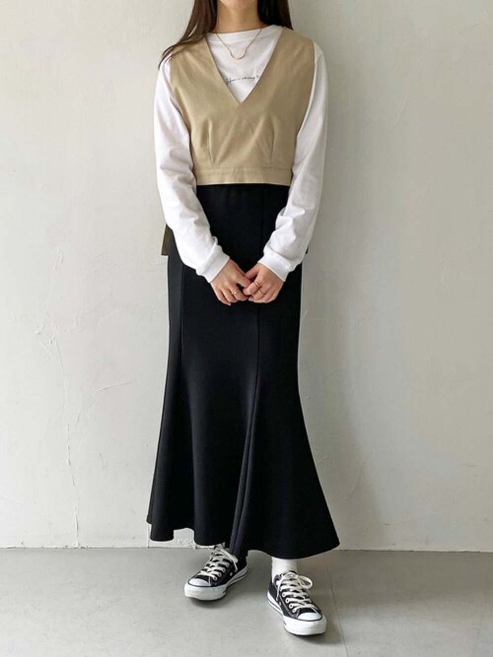 ご覧いただきありがとうございます🫶🏻 セットアップで販売しているアイテムのベストのみを使ったコーデ🍓 HERCLOSETで人気のロンTとレイヤードすれば大人カジュアルな雰囲気に! ベストはサイドにベルトが付いているので調節できるのが嬉しいポイント👌🏻