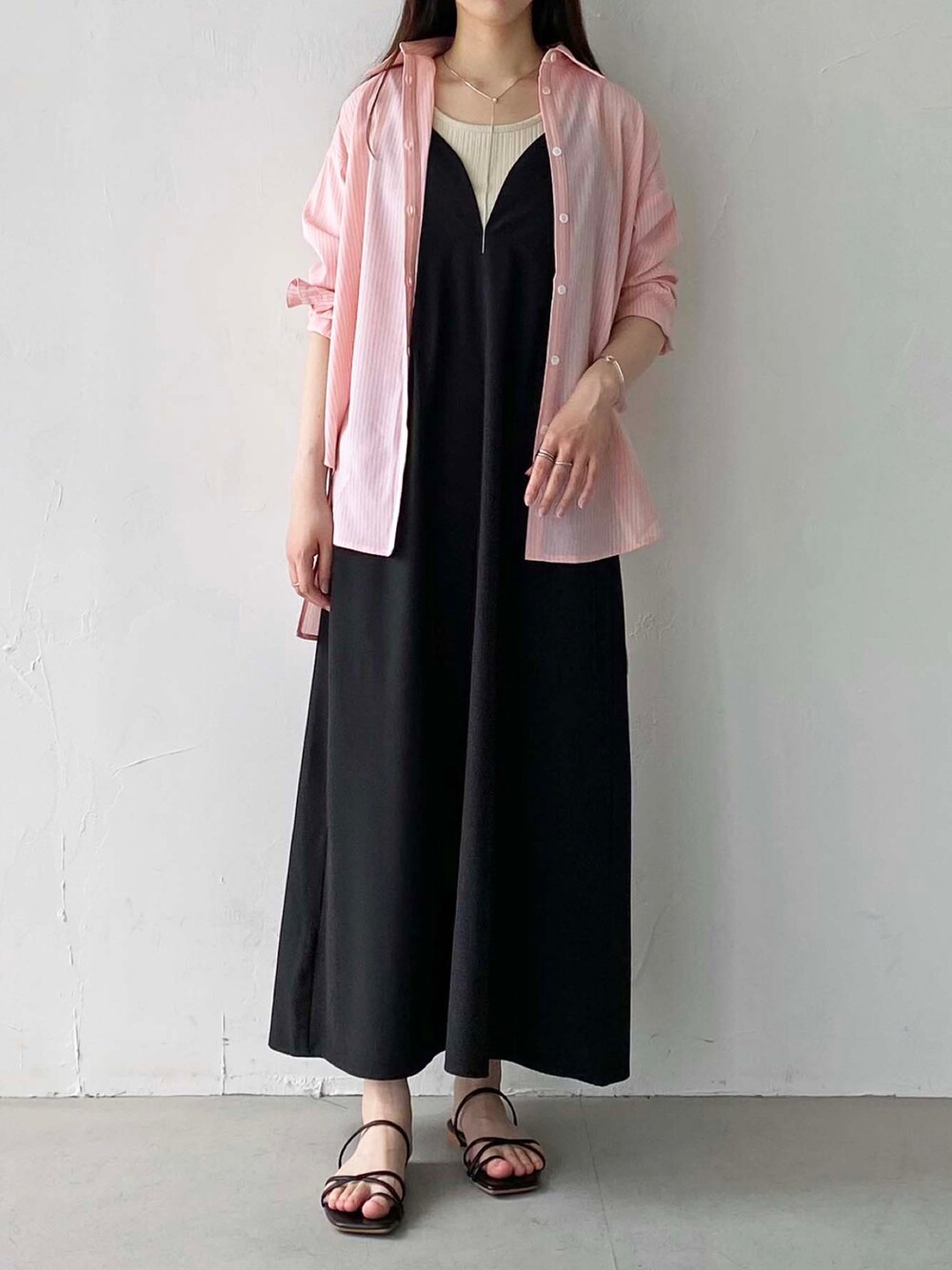 ご覧いただきありがとうございます🫶🏻 バックのヨークデザインがポイントのストライプシャツに キャミワンピースを合わせたレイヤードスタイル🥳 爽やかなピンクカラーがコーデを華やかにしてくれます!