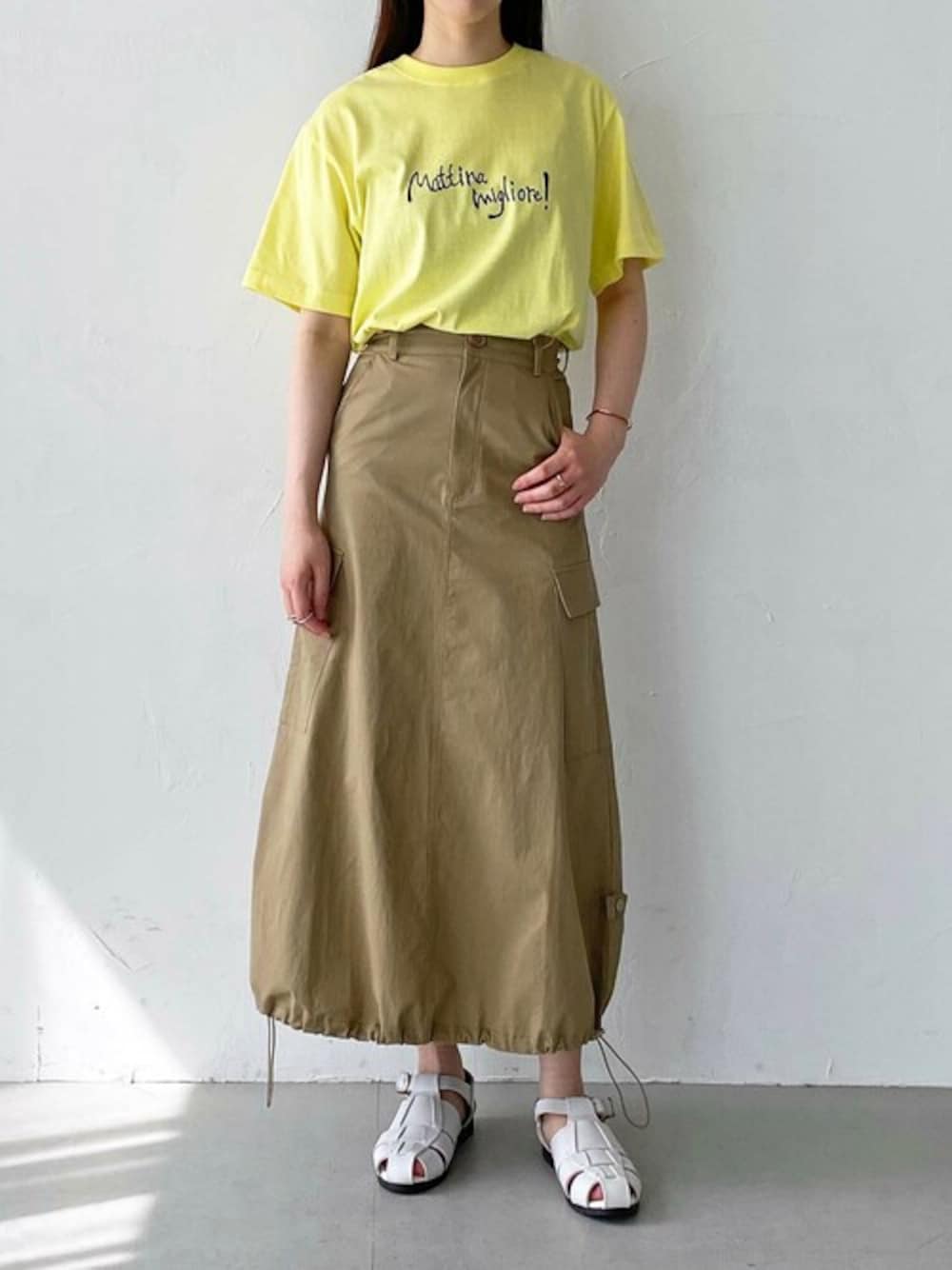 ご覧いただきありがとうございます🫶🏻 夏らしいカラーのロゴTシャツと 新作のドロストスカートを組み合わせたカジュアルなコーデに! スカートは裾のコードでシルエットを調節できます👌🏻👌🏻