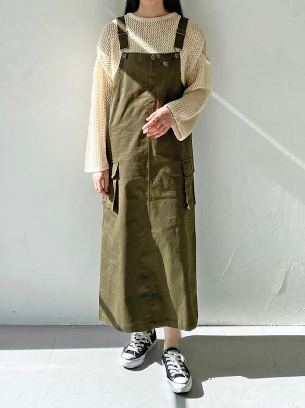 ご覧いただきありがとうございます🫶🏻 ミリタリーテイストのジャンパースカートが入荷しました! レイヤードするアイテムによって違った雰囲気が楽しめます🫠