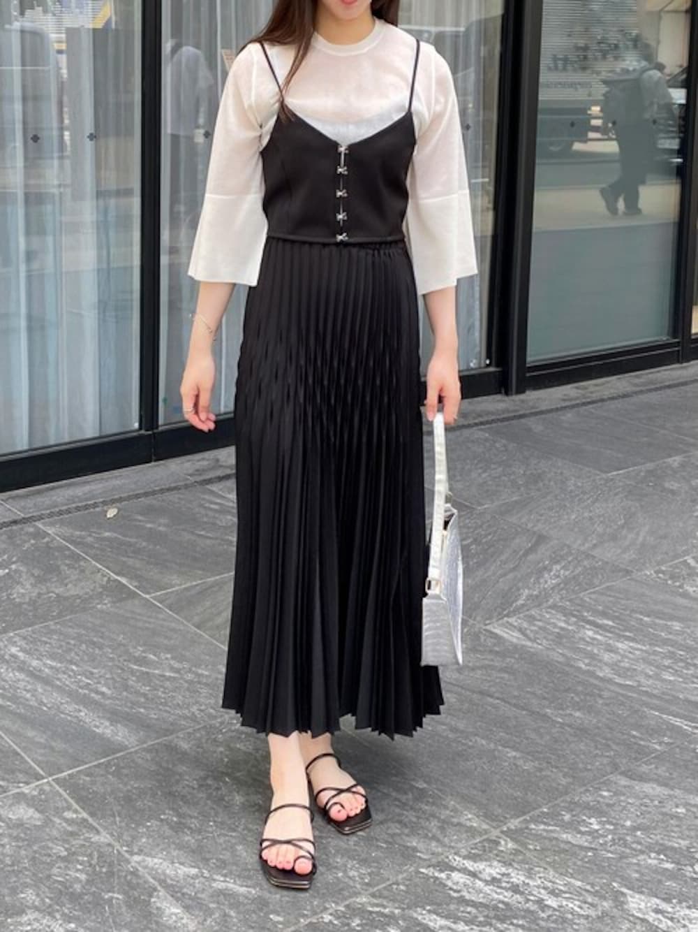 ご覧いただきありがとうございます🫶🏻 袖口にスリットの入ったシアートップスを使ってモノトーンコーデ🩶🤍 ビスチェを合わせれば、より引き締まった印象に!