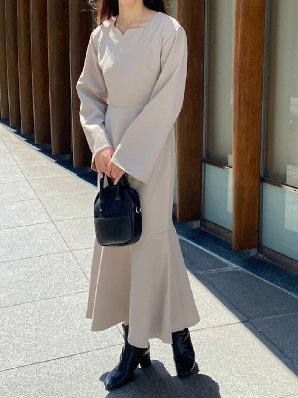 Rina(HER CLOSET)のドレス「【CLEIO】ベルスリーブフレアロングワンピース/BELL SLEEVE FLARE LONG DRESS/293-10607」を使ったコーディネート