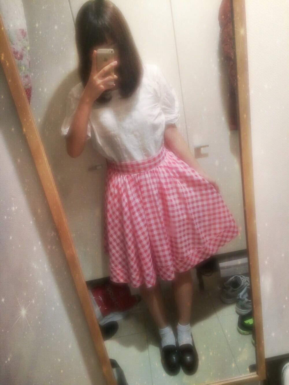8.2 red × white💌 point ☞シンプル且つカジュアル🙆🏻 ☞袖がちょっと珍しいところ👀❤️ ☞ギンガムチェックでキュートに🎀 学校行こうとしたけど雨強すぎて帰ってきてしまった😌笑