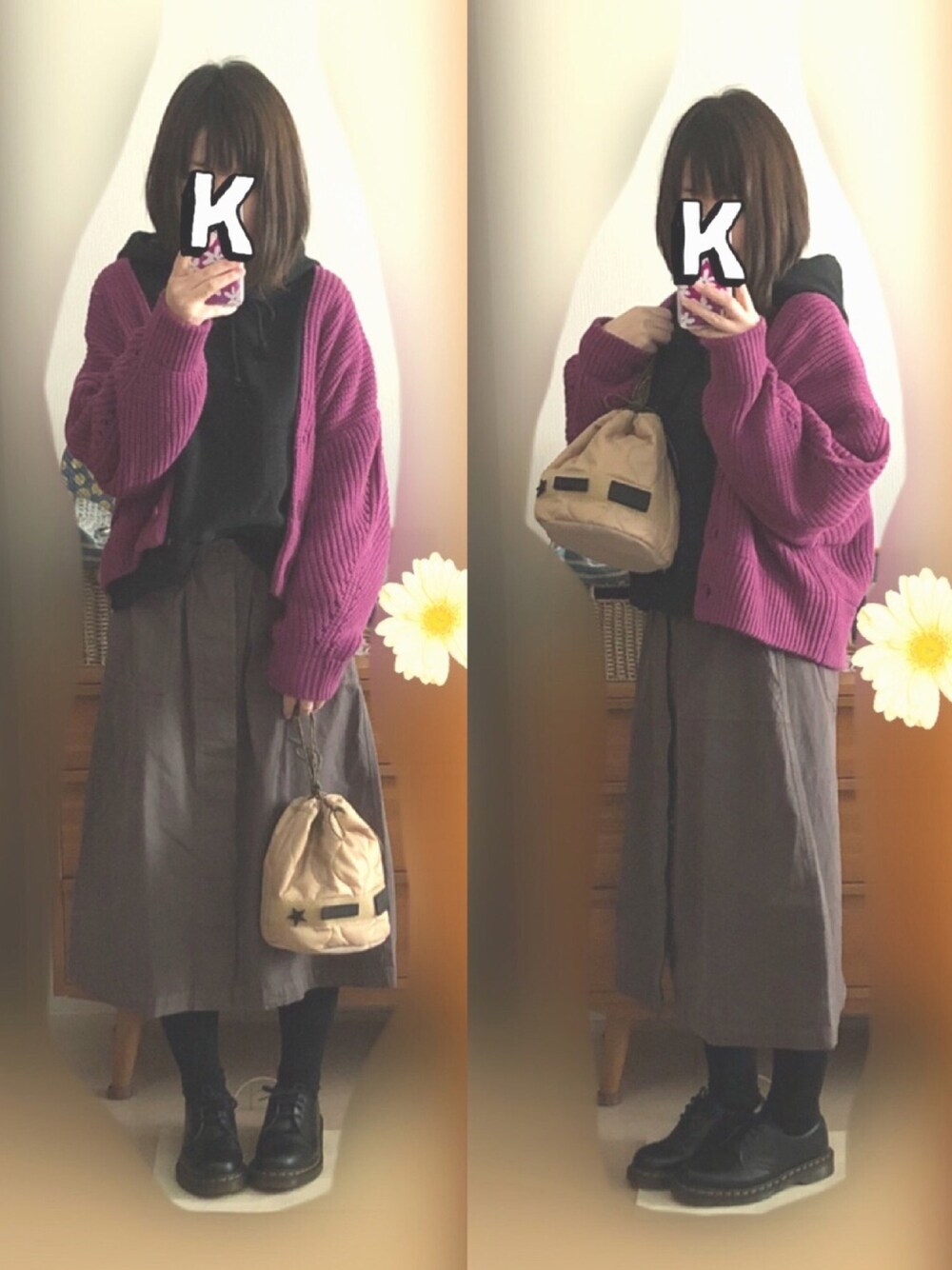 KBFのパーカーにmysticのゆるカーディガン羽織りました♡ わたしには珍しく色物カーディガンです♡ あれ?でも、最近パープル集めがちかもしれません🙈✨笑 モノトーンに合わせやすくて、ついつい暗くなりがちな冬物が明るくなります♡ 特にグレーとパープルの組み合わせが好きです♡ 巾着バッグはKBFです♡マジックテープの所なくさないように気をつけなきゃ🙈✨