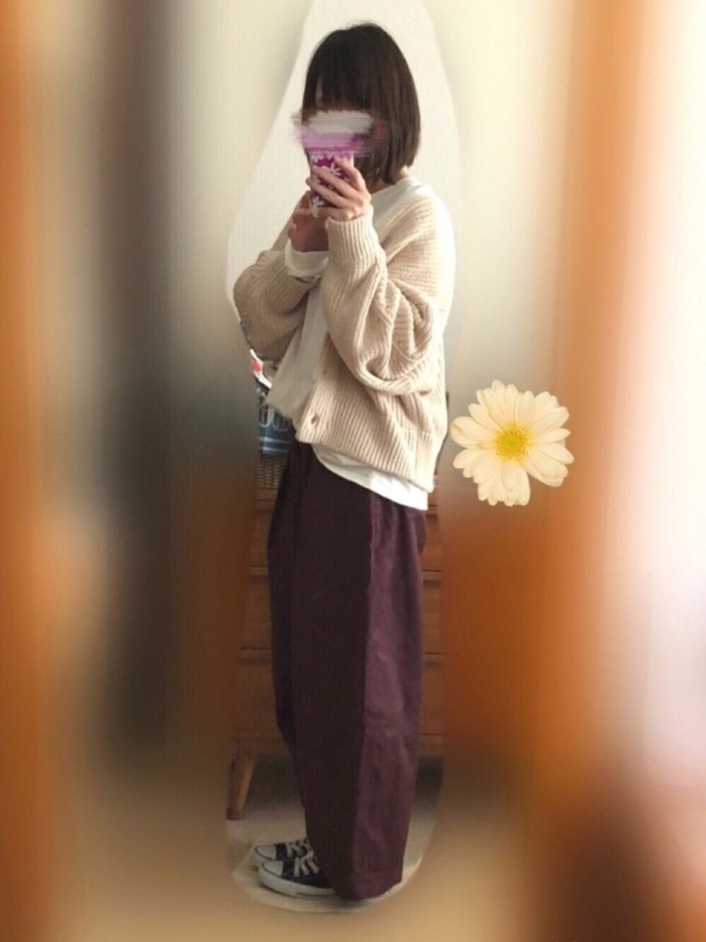 nikoのブラウンのワイドパンツにmysticのロンTとカーディガン合わせました♡ ブラウンのグラデでチョコケーキ🍫🍰なコーデです♡ カーディガン、クリームに見えてくる…🙈💕 北海道は昨日も雪の台風かと思うくらい寒くて、身体が縮こまりました🤢途中で歩いてるのか遭難してるのかわからなくなりました笑 そんなとき、ゆるゆる〜なコーデは気持ちもゆるりとほぐれます🙈❤️