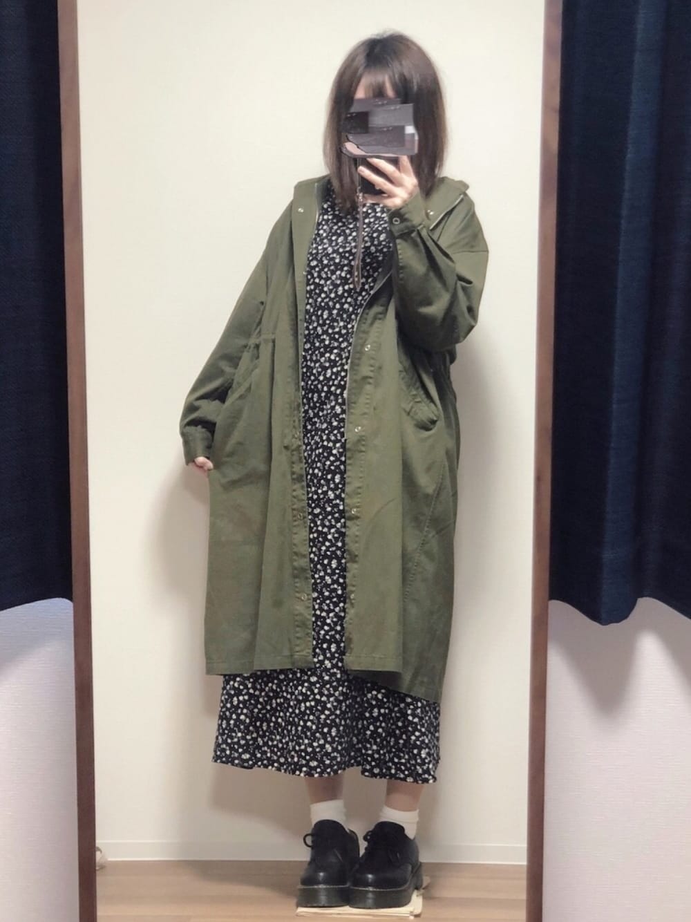 なにを強調したかったのかよくわからないポーズ…😶🙃 アースのワンピースが小花柄なので、カーキのミリタリーコートあわせました💚