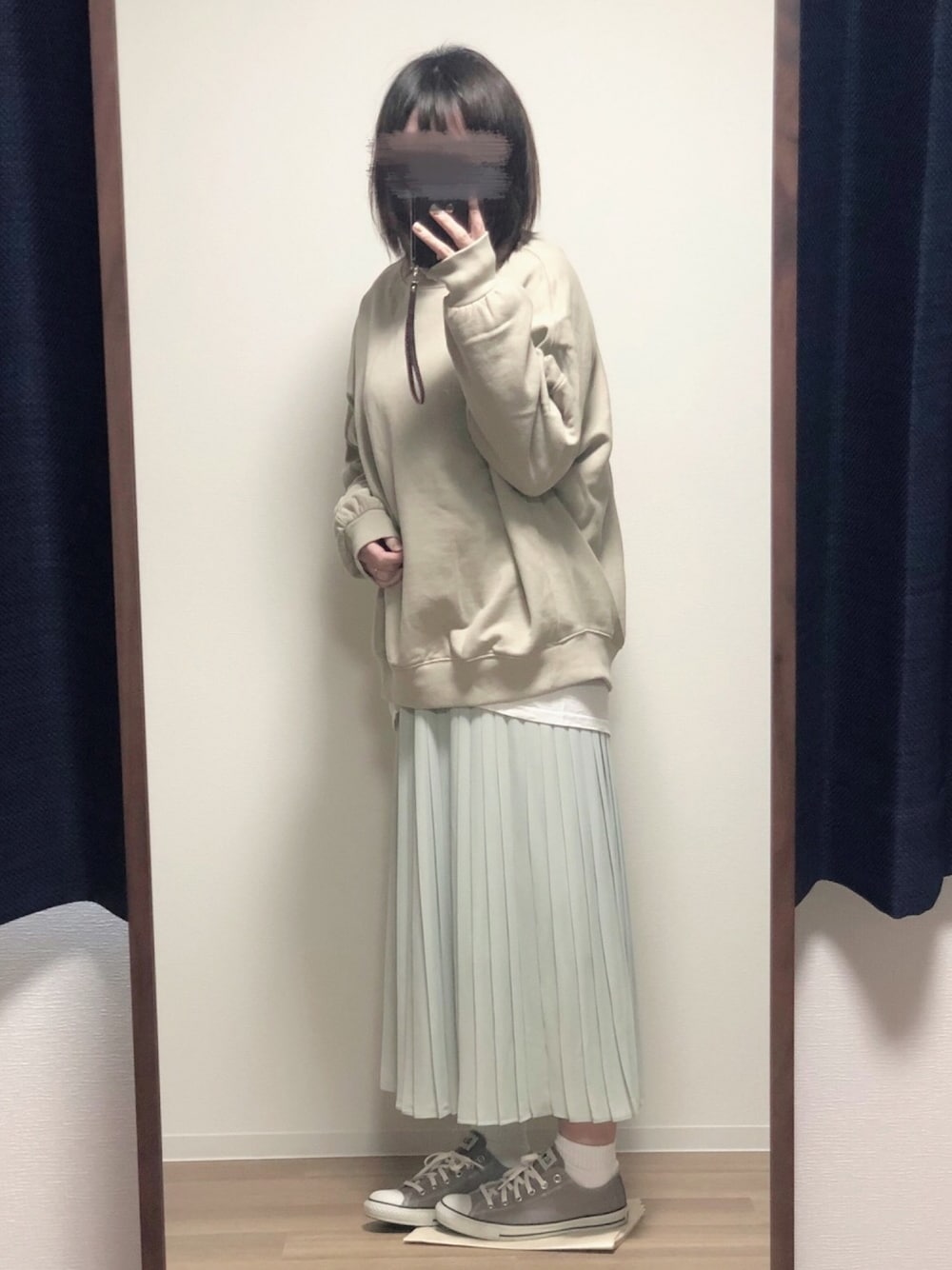 【よく使うアイテム👗スウェット】 さし色に春らしいグリーンのスカートも揃えました♡ ユニクロのプリーツスカートは優しいグリーンが本当に可愛いです🥺🌷ふわっと軽い素材で、広がりすぎないので大人っぽく着られます♡ トップスは、本当によく使うローリーズのオーバーサイズなスウェットです🧸🤎何にでも合わせやすいので、本当に買ってよかったなぁ🥺✨