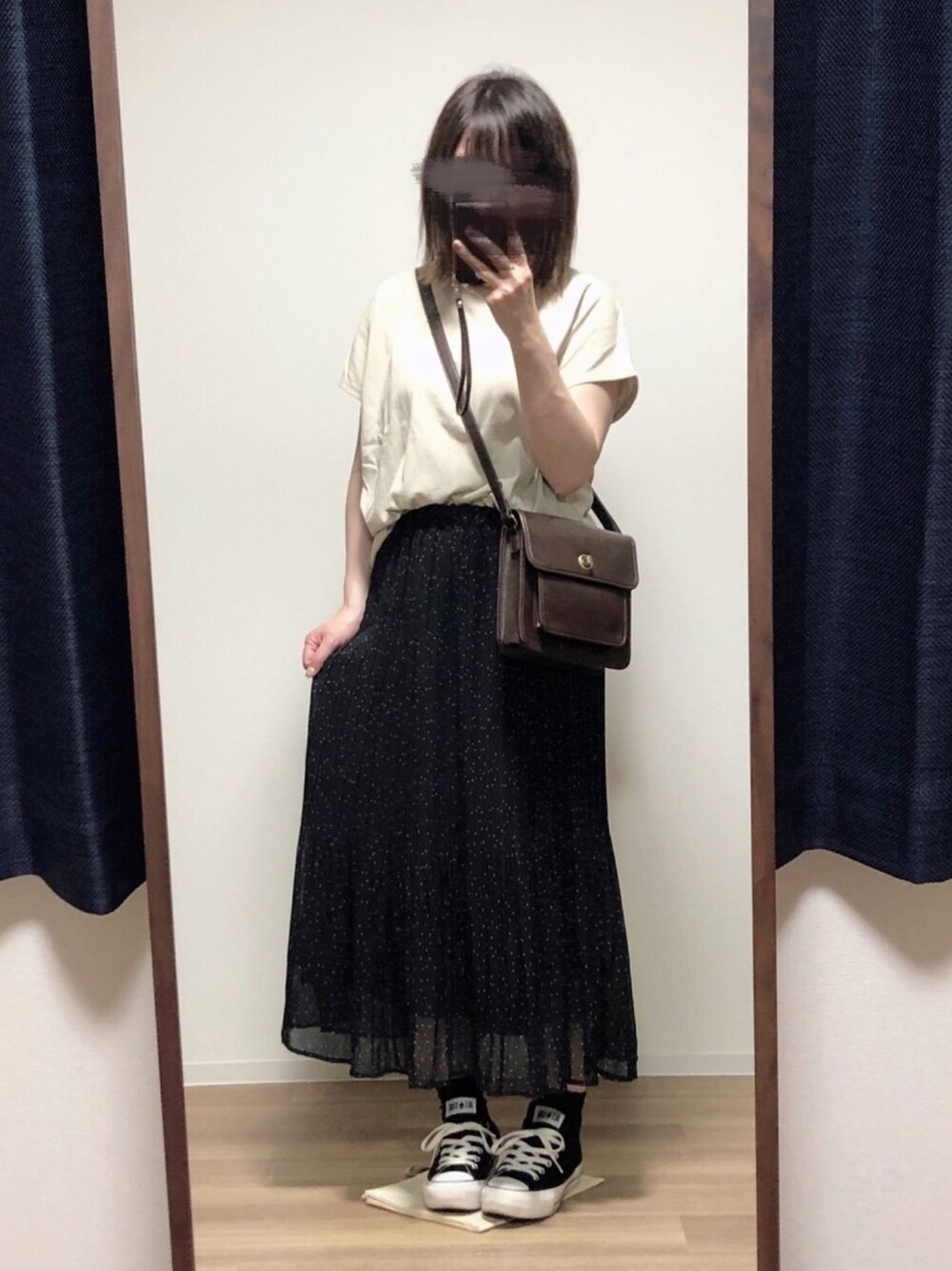 エヘカソポとまるちゃんのコラボのスカートにユニクロのお気に入りのTシャツ合わせました🙈🌷 スカートはランダムなドットと消しプリーツがとても可愛いです♡ ユニクロのTシャツはプチプラで可愛いので多色買いしてしまいました🥺💕