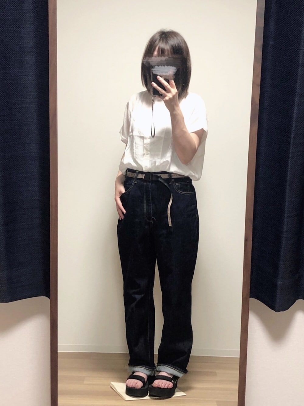 デニムに白シアーシャツでシンプルに🥰 ベルトでアクセントをつけてみました🙈🌷CORNERSのシアーシャツは前を開けて羽織としてきてもとても可愛いのでお気に入りです♡