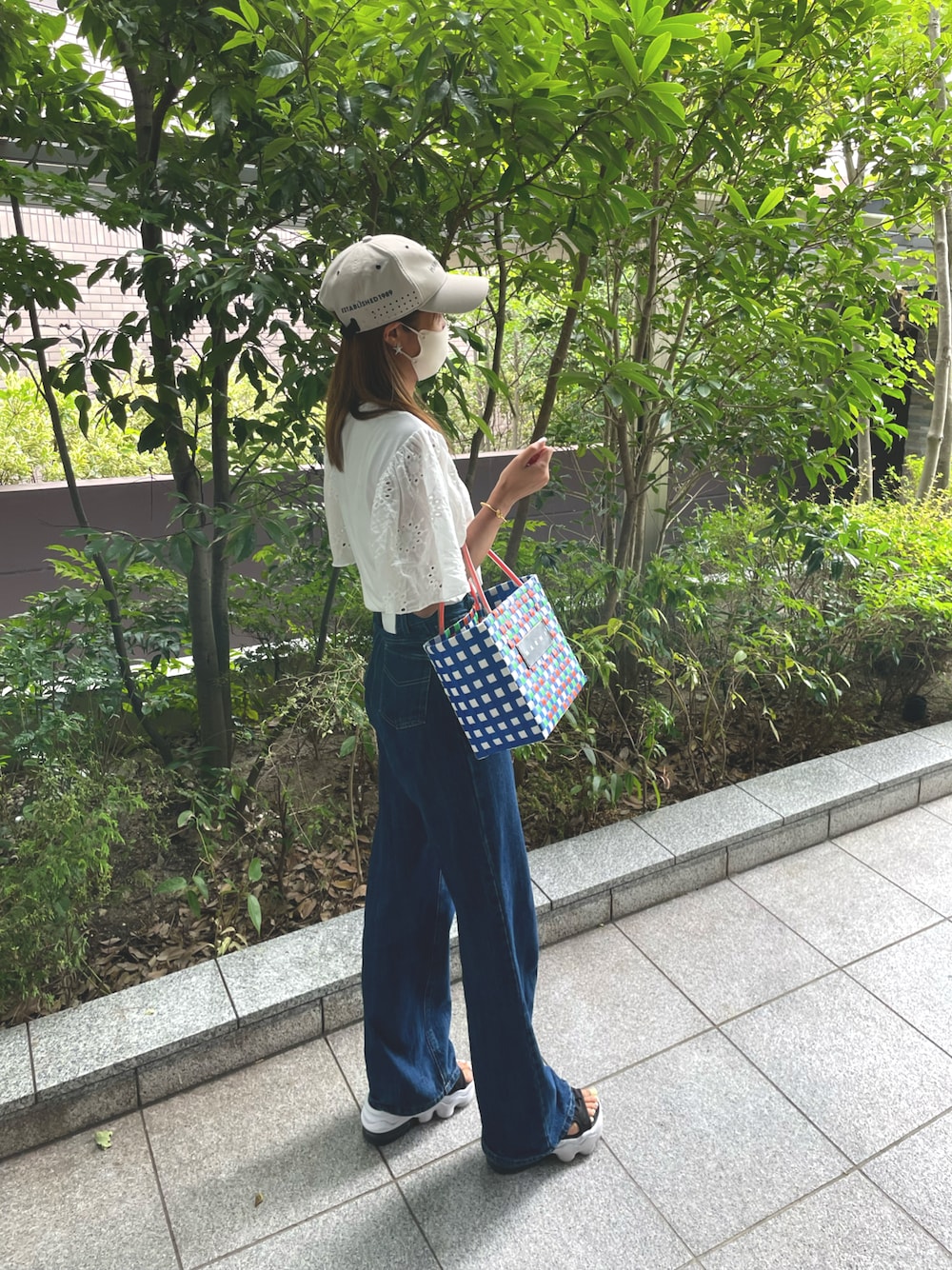 トップス→SHEIN アイレット刺繍バタフライスリーブティー ホワイトS $7.68 デニム→COCOTTEPARIS ハイウエストフレアデニム S 8,800円