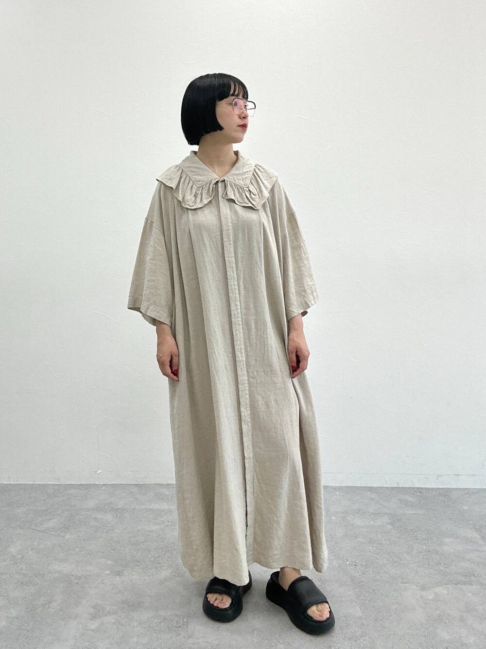 リネンレーヨンの清涼感と落ち感が大人な女性の雰囲気をだしながら、大ぶりなフリルカラーが少しロマンティックな印象で存在感のあるワンピースです。 1枚で印象的で夏にぴったりなのでおすすめです。