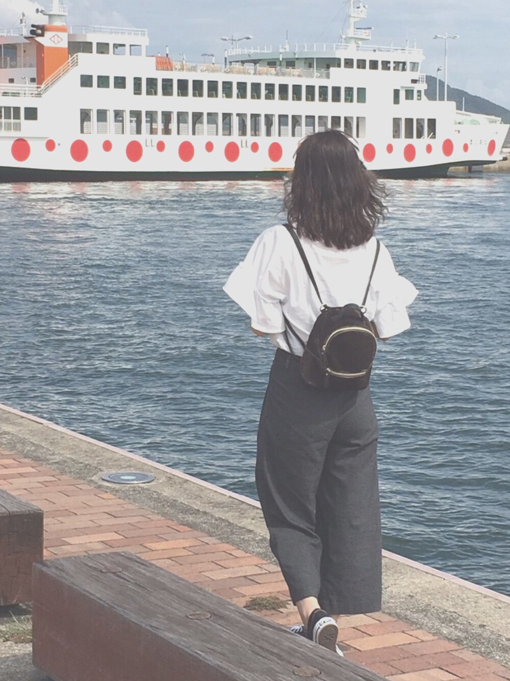guのワイドパンツは 3年前くらいにゲットしました 今でもお気に入り◎ この日は島へ行ってたので 動きやすいようにリュック。 ベロア生地のリュックで少しだけ秋意識、 色味はやっぱり暗めを選んじゃう、 instagram : ch___pi08