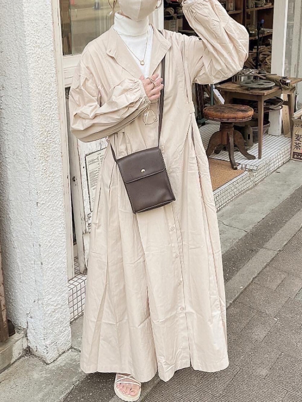 R I のシャツワンピース「【陽コラボ】ボックスタックロングシャツワンピース」を使ったコーディネート