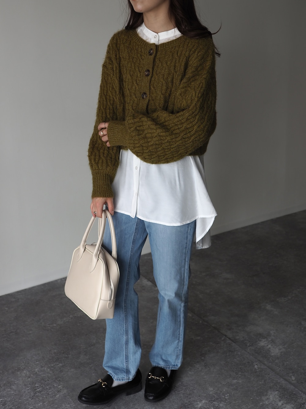 Riberry_official(Riberry)のカーディガン/ボレロ「前後2WAYショートケーブルカーデ」を使ったコーディネート