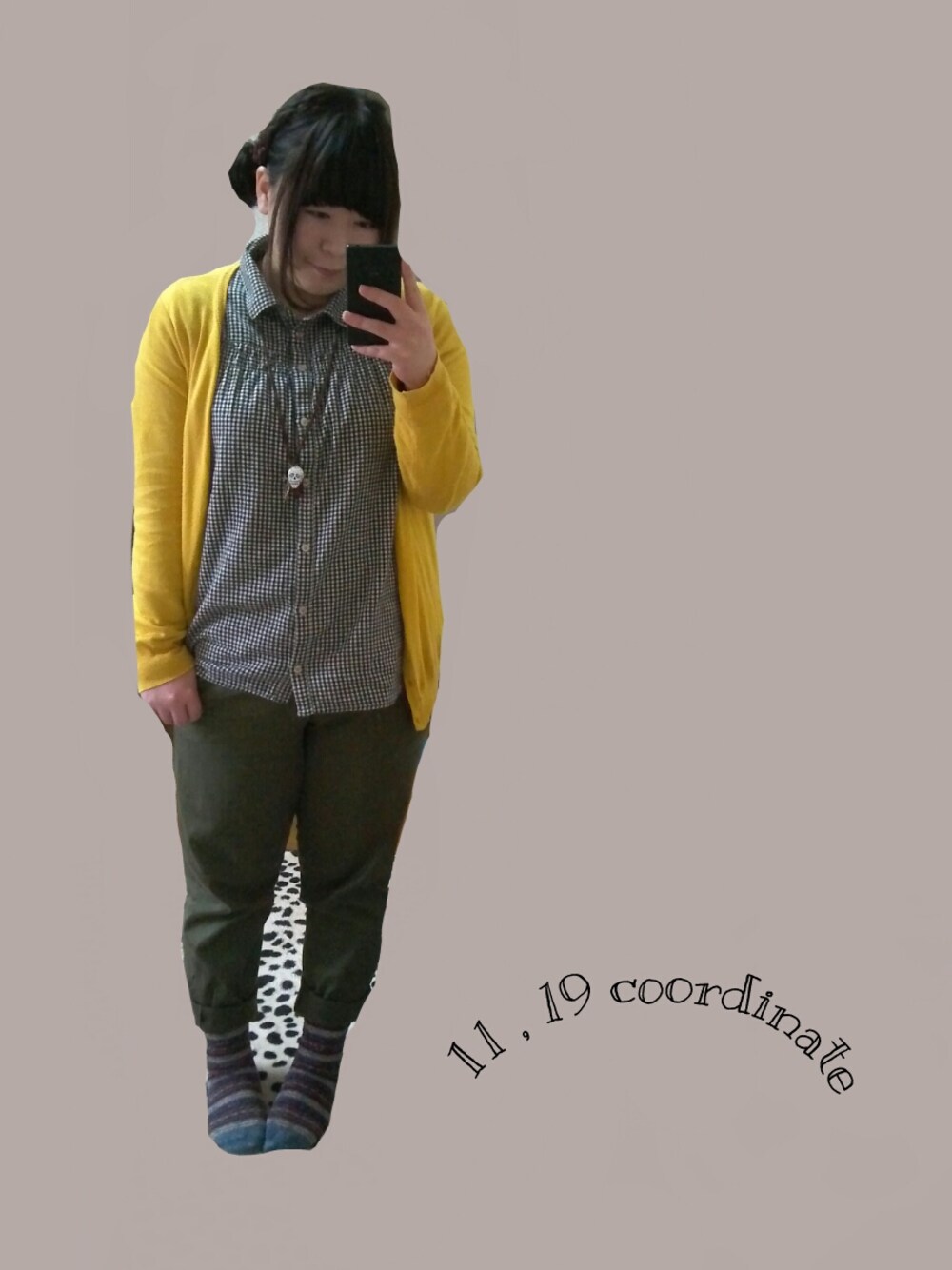 カーディガン / Honeys ギンガムチェックシャツ / Honeys カーキパンツ / ??