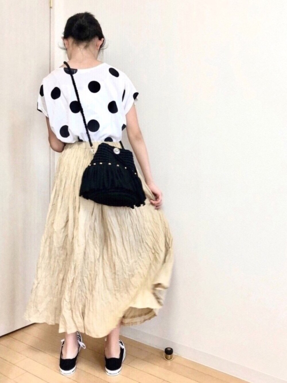 ご覧いただきありがとうございます😊 季節も夏と秋を行ったり来たりで、コーデも迷走中、、。 サンダルからスニーカー、カゴからフリンジショルダーバッグへ👟👜 ロングスカートを履くとちょっとお姉さんぽくなるので、大きめのドットTシャツで可愛さを足してみました♪