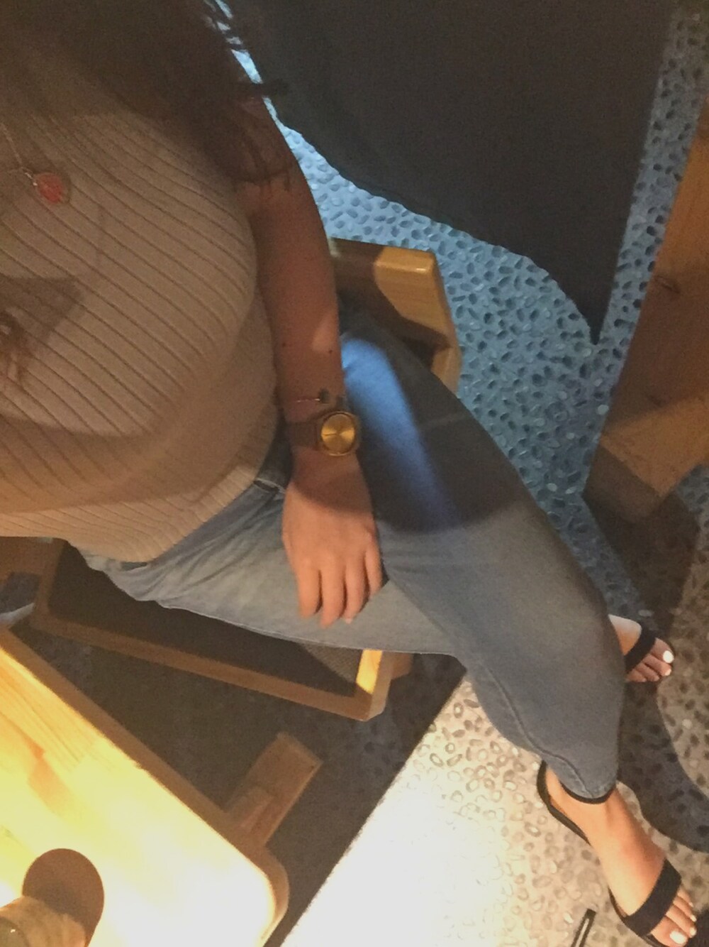 ブルー系のデニムパンツ、ブラック系のサンダルを着用したレディースの夏コーディネートの1枚目の写真