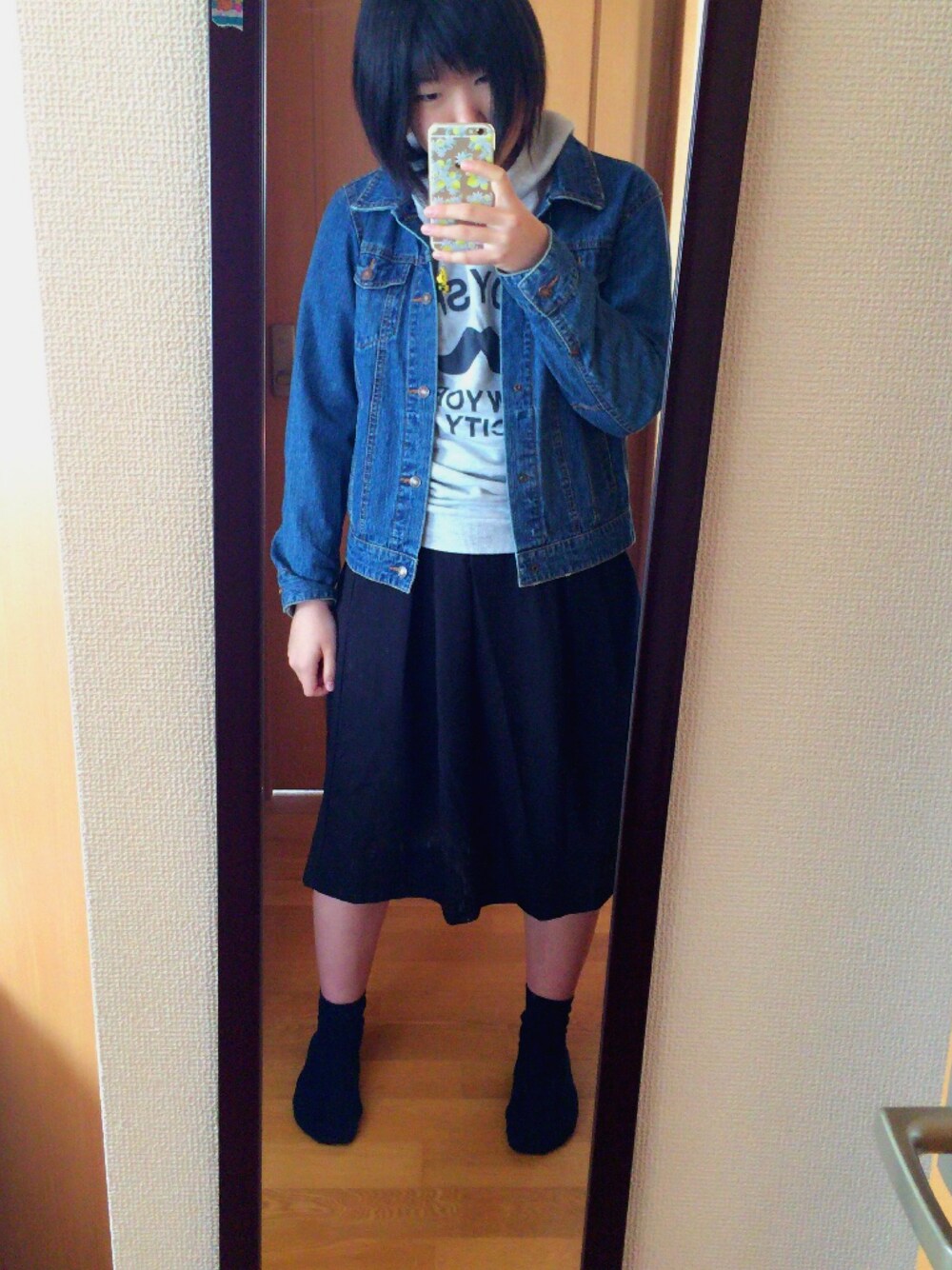 ジージャンにフードです ボーイッシュに決めました スウェットのロゴと同じboyish 自転車なので春色のスニーカーで行きます