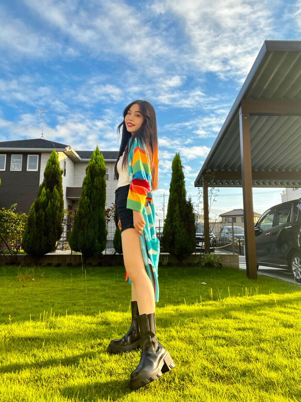 初投稿🌈 お天気が良かったので 久しぶりにgalaxxxyのカーディガンをおろしてみました♪ EMODAのブーツの脚長効果ばつぐんです(´˘`*)