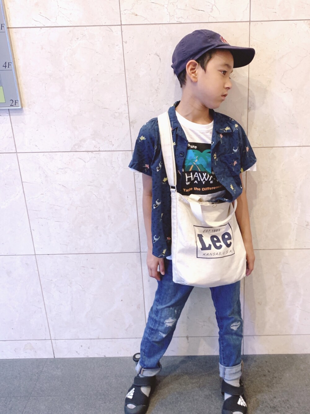 ハワイのvintageTシャツに謎柄のシャツ。 アロハっぽくて夏感出てます。 Leeのバッグはいつのまにか子供の物に。 水筒入るの嬉しいけど、生地柔らかいから変形するのがダサめ笑。