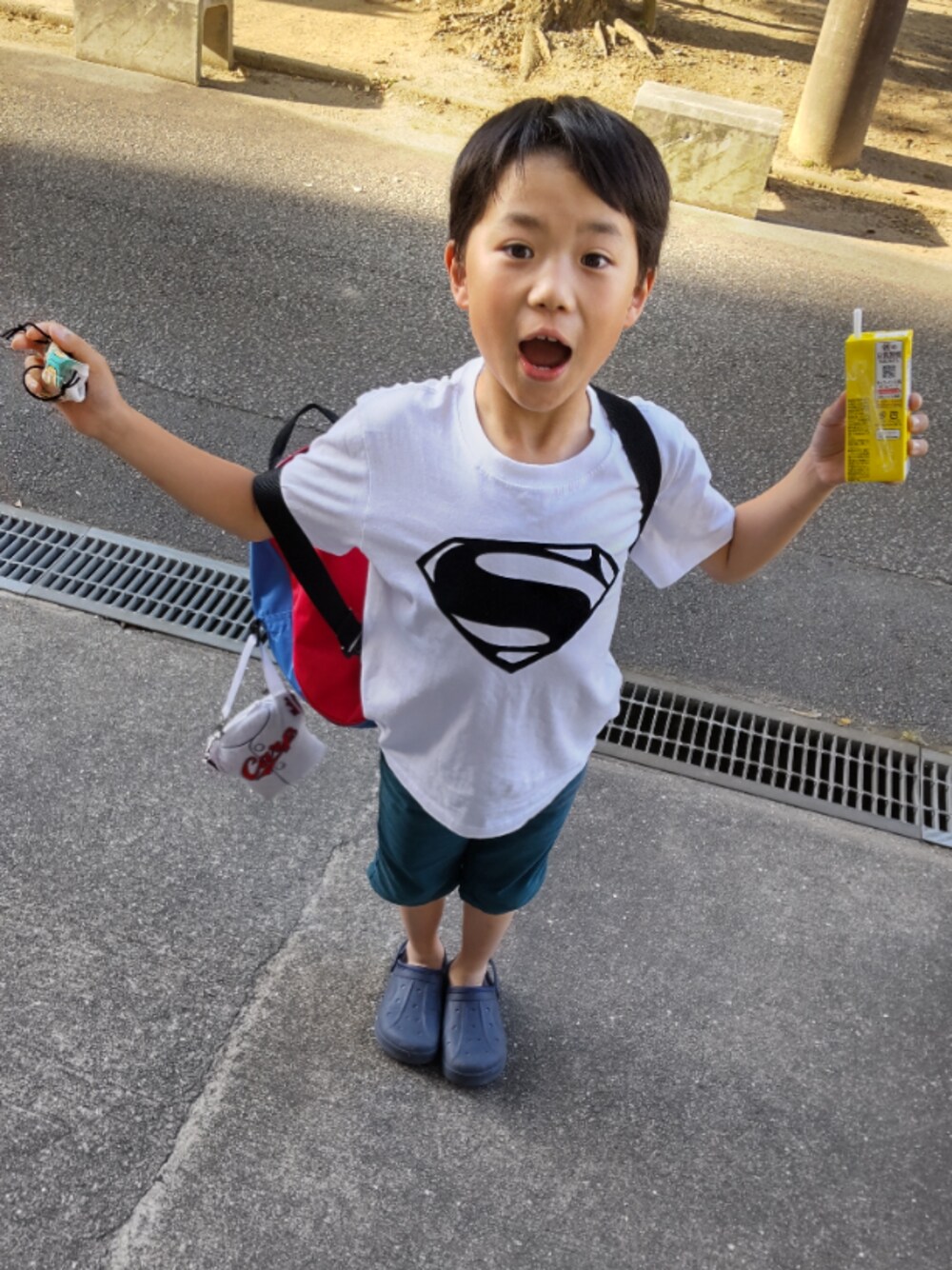 ˗ˏˋ 6/1 ˎˊ˗登校&スイミングのコーデ スーパーマン♡「パ」の口です🤭笑 Tシャツは激安アウトレット的なところで 490円、しまむらのHPは990円 約1500円の超プチプラコーデでした❣️ 余談✐このTシャツ買ってたの忘れてて 見つけた時にはjust sizeの130😱 でも着てみたら意外と大きめで余裕でした🙌 そしてハーフパンツは膝隠れないと嫌な子🤭