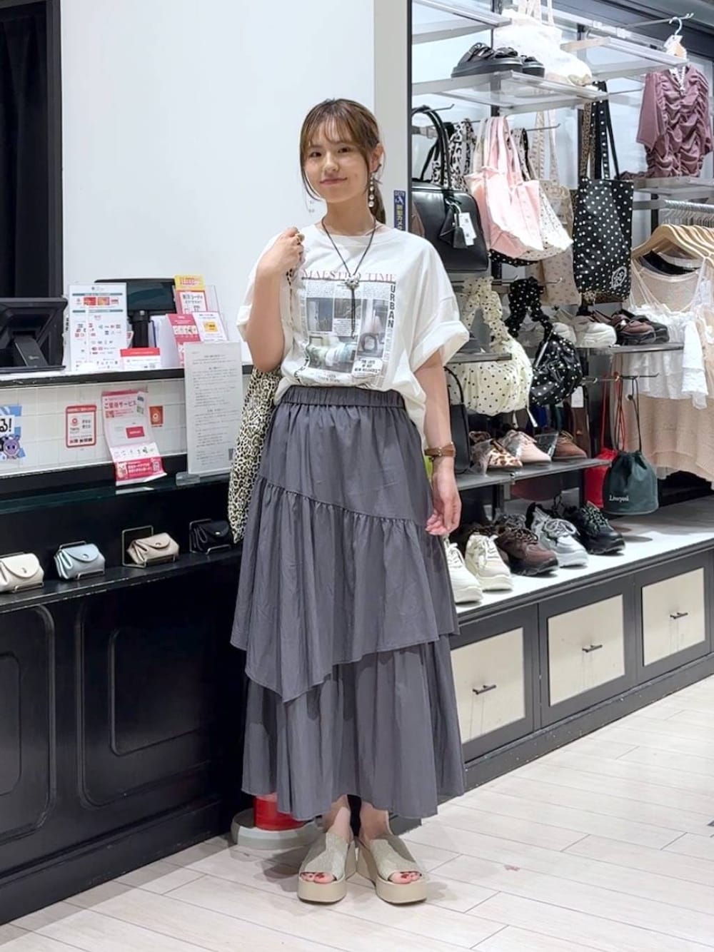 〈スカート〉(サイズ⇨フリー) →アシメティアードのデザインのスカート! フレアシルエットで大きく見えがちなスカートも、 アシメデザインですっきり見えします!!! トップスはコンパクトめがおすすめです🥰 〈トップス〉(サイズ⇨フリー) →店頭でも人気のBIGTシャツ! サイドにスリットが入ってるので、こんな感じで前だけインするとボリュームのあるボトムスにも合わせやすい😚 薄めの生地感なので、暑い夏乗り切れそうです🌻