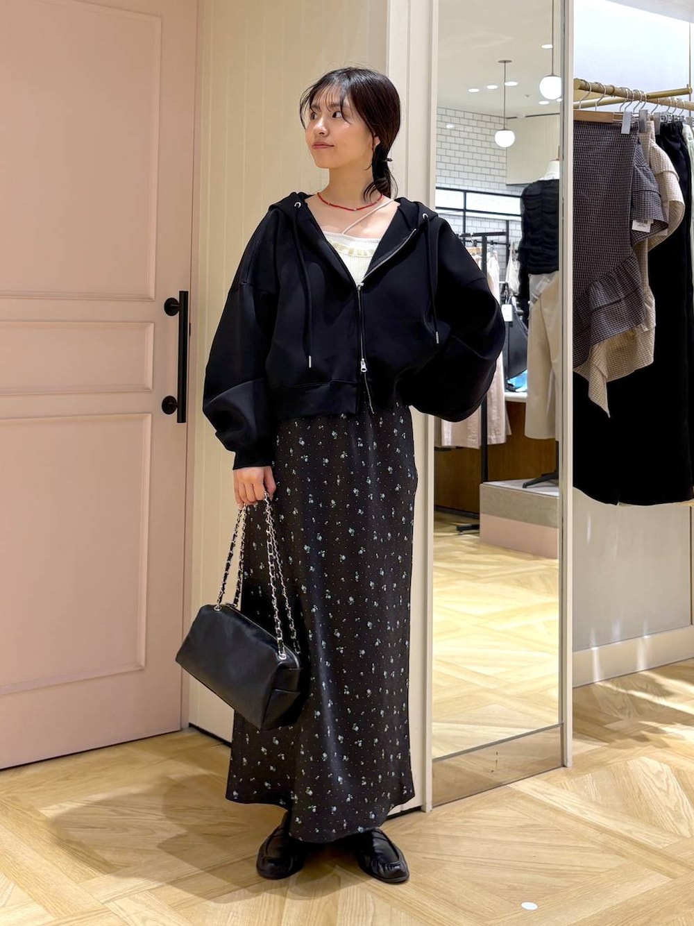 春のブラックコーデ🐦⬛♡ 小花柄で春らしくしてみました🌼 朝晩はまだ冷える時もあるので大活躍するフード! カラー展開豊富なのでチェックしてみてください🥰