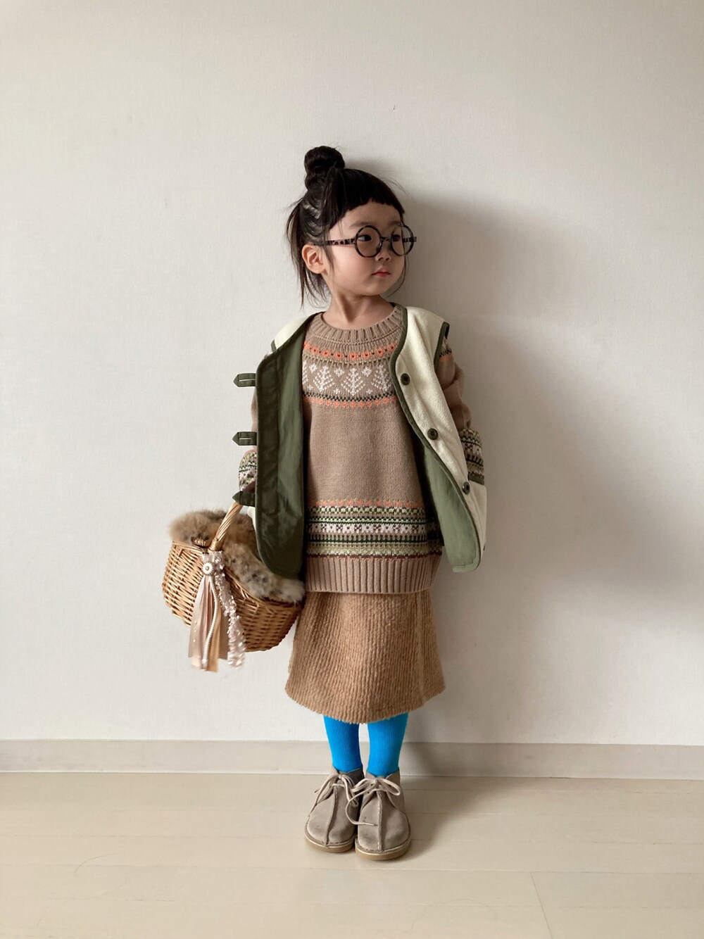 ベスト羽織ってみたver.⑅◡̈* この色合わせ好きです☻ @beams_mini ノルディック柄ニット🧶のチラッとオレンジが今年っぽくて可愛い😍