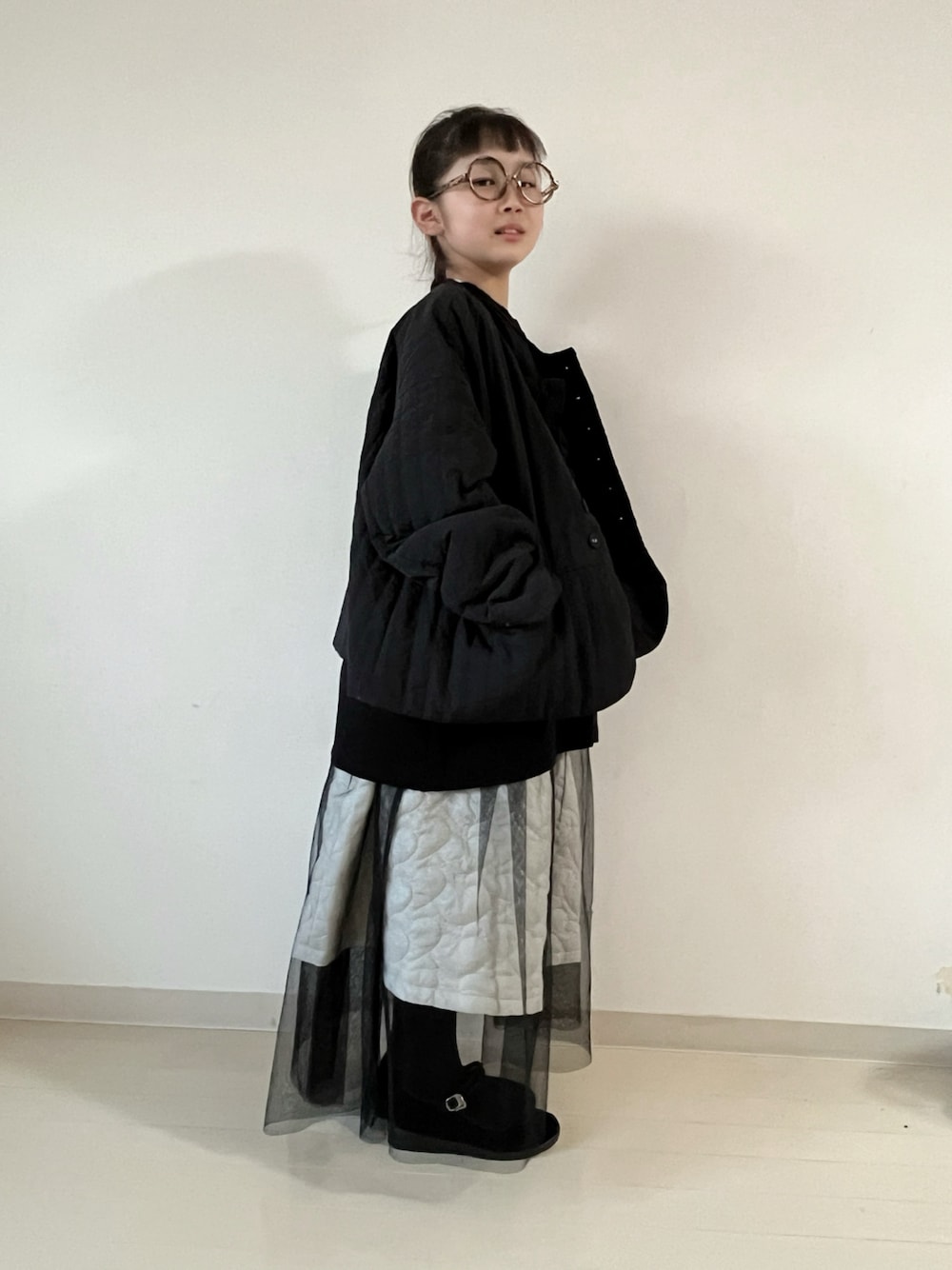 lowrysfarm kids for junior࿐ ❁ キルティングショートジャケット ❁ リボンBIGプルオーバーLS ❁ キルティングミディスカート リボンが沢山着いたニット🧶は、 形がカッコいいからか以外とモードな雰囲気が出て良い感じです🙆 コートとスカートはSALEになってるのでチェック☑️してみて下さい😍 チュールのワンピと重ね着 お気に入りコーデです🤩