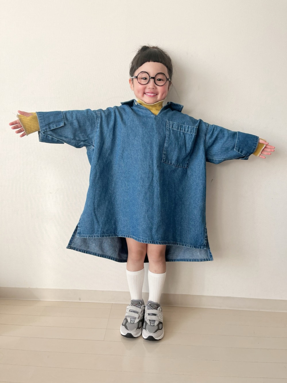 lowrysfarm kids ·͜· ︎︎ᕷ·͜· ︎︎ᕷ·͜· ︎︎ᕷ ❁ デニムスキッパーシャツワンピース ❁ K/ハイショクリブSソックス 春物も可愛のが沢山のlowrysfarm kidsのデニムシリーズ𓃰⋆⋆ 前後で丈が違う技ありワンピ◡̈⃝* 前からみたワカメちゃん丈がなんとも可愛いです😍 襟を抜いて着た時の後ろ姿の可愛さもたまらない◡̈♥︎ 靴下はつま先と踵に黒の配色🐦⬛ →通学通園に履いても汚れが目立たない優れ物🙆♀️ プチプラだしおススメです💁♀️