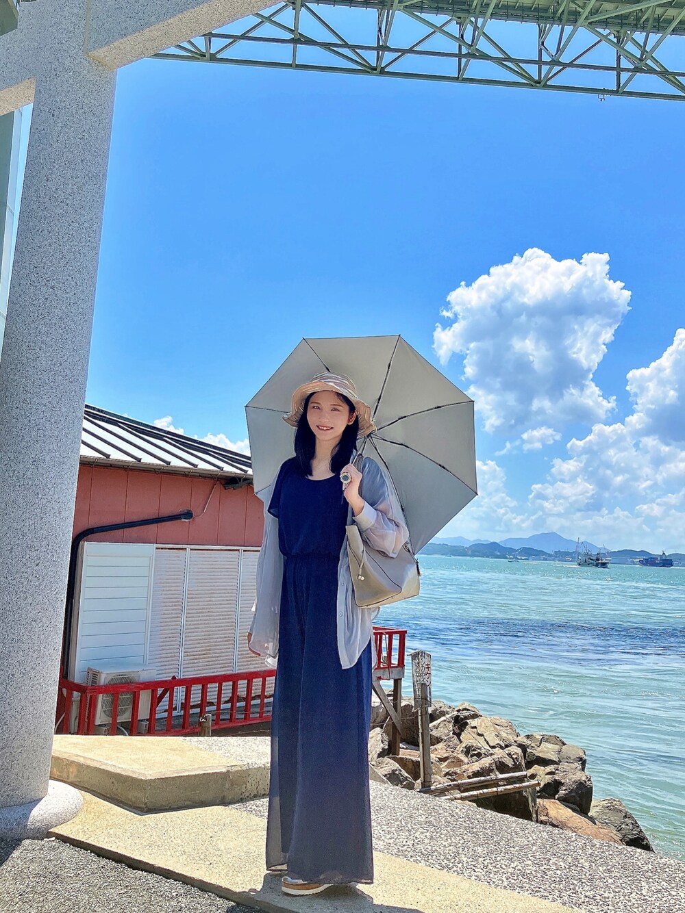 関門海峡へ🌊 濃紺のオールインワンにグレーのシアーシャツです☻