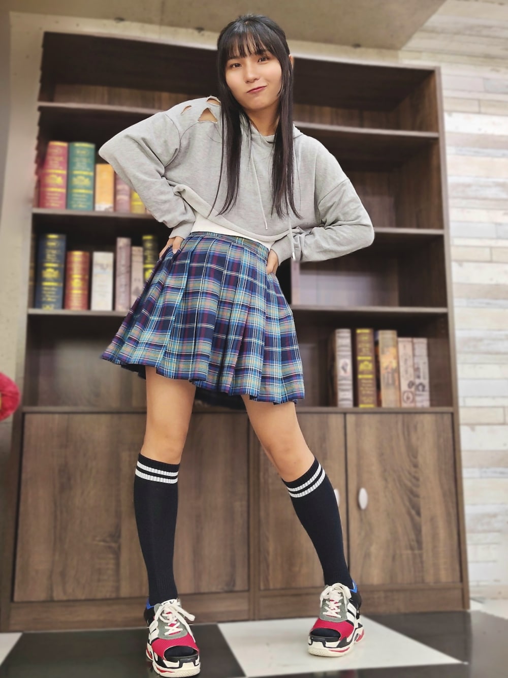 超ショート丈のパーカーとチェックスカートでスポーツmix☻ スタジオにあったスポーツサンダル?スニーカーサンダル?が可愛い。