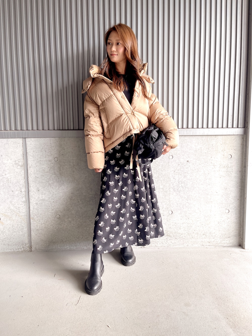 秋めいてきたからロングスカートを別に着まわしてみてショートブーツに👢 明るいダウンをカッコよく着る