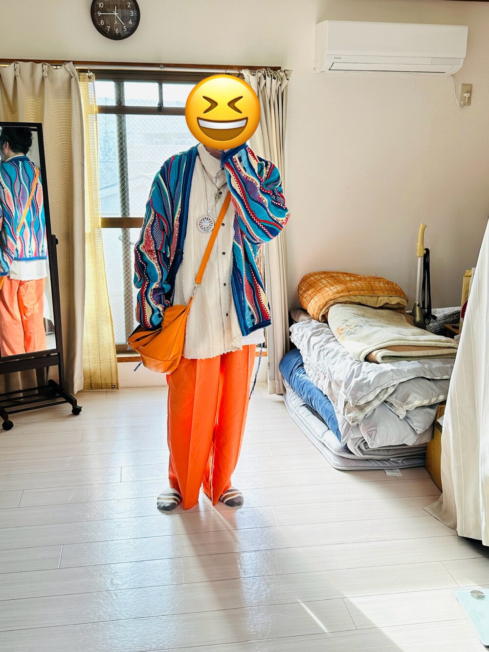 メゾンスペシャルのカーディガン キャスパージョンのシャツ メゾンスペシャルのバッグ guのスラックス オレンジをメインにコーデしてみました。 写真には写ってないけど足元はリーガルのローファーを履いてます。 あと、靴下サボってしまいした。笑 しかも人ん家で家主に撮影してもらいました