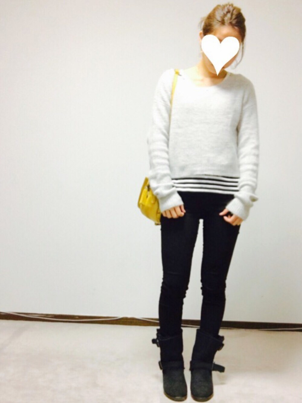 全体的にモノトーンなので、黄色のバッグを差し色にして、ブーツでカジュアル感とボリュームを出しました◡̈